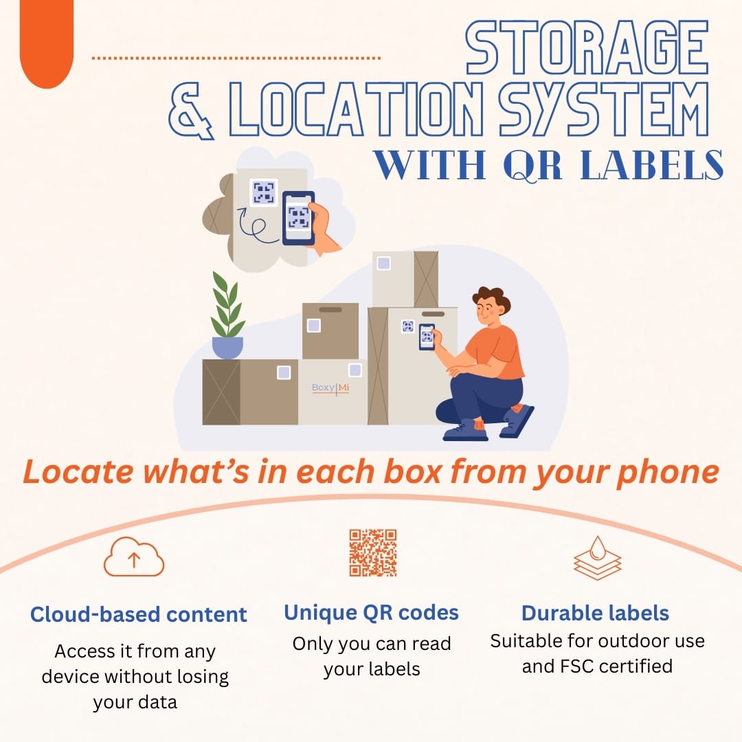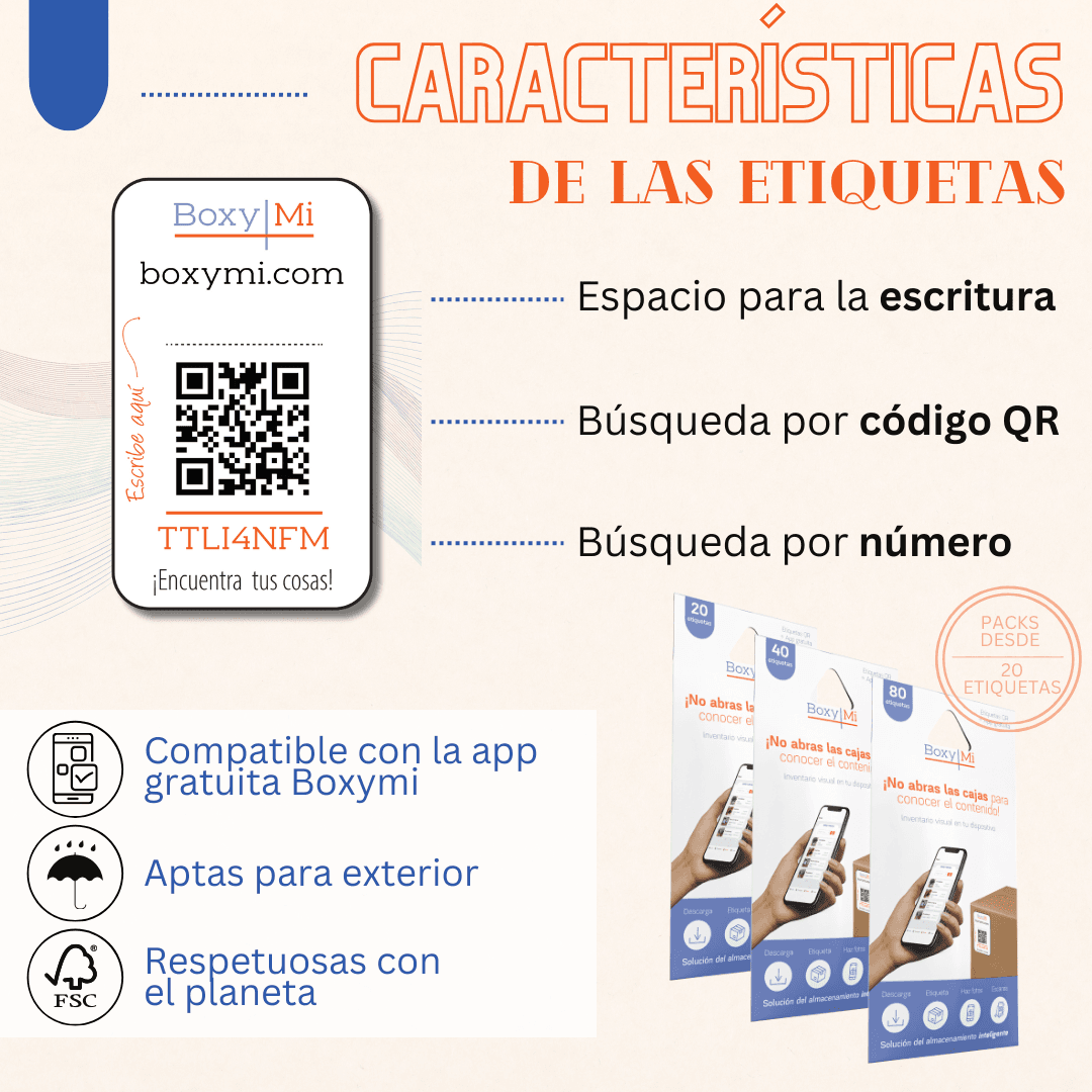 Con nuestras etiquetas con códigos QR que puedes pegar directamente en la caja, escanear y averiguar todo los detalles del contenido de la misma.